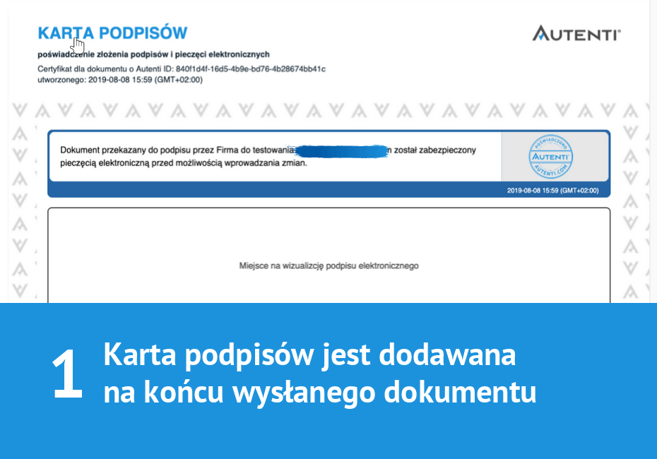 Podpis elektroniczny to ciąg bitów dołączony do dokumentu elektronicznego, który potwierdza złożenie oświadczenia przez podpisującego. Jednakże podpisy elektroniczne tworzą i weryfikują komputery, wobec czego ich treść jest raczej niezrozumiała dla zwykłego użytkownika. Aby zaradzić temu problemowi w Autenti wypracowaliśmy i wdrożyliśmy Kartę Podpisów - innowacyjne rozwiązanie, które pozwala zobaczyć wszystkie złożone podpisy elektroniczne.