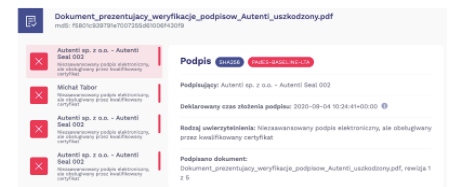 Każdy niekwalifikowany podpis elektroniczny złożony na Platformie jest zabezpieczony pieczęcią elektroniczną Autenti.
