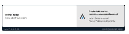 Ilustracja 1 - podpis elektroniczny Autenti osoby uwierzytelnionej za pomocą adresu e-mail, bez wskazania organizacji podpisującego, a więc pozostającej najczęściej z nadawcą w relacji konsumenckiej. Pole to zawiera imię i nazwisko podpisującego oraz jego adres e-mail, za pomocą którego nastąpiło uwierzytelnienie.