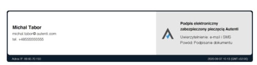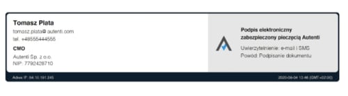 Ilustracja 3 - podpis elektroniczny Autenti, gdzie podpisujący został zweryfikowany zarówno mailem, jak i SMS-em. Podpisujący reprezentuje w tym przypadku również swoją organizację, a jej dane zostały ujawnione w podpisie. Są to: nazwa firmy, numer NIP oraz rola (funkcja), jaką podpisujący pełni w organizacji.
